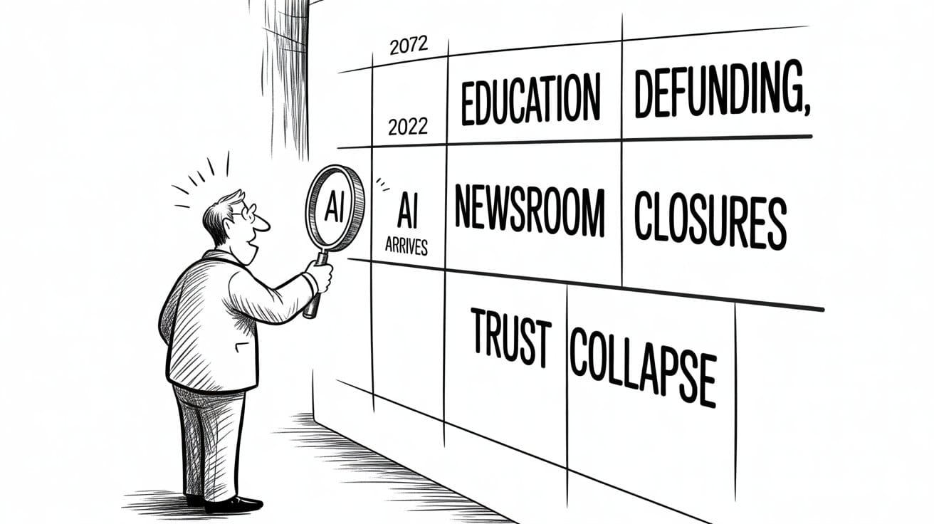 ChatGPT ”entered the chat” at the end of 2022 and by then, American democracy was already in critical condition. Higher education was already a debt trap and journalism was already bleeding out. Social trust? Already extinct.