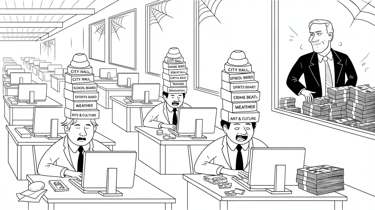 Your local paper, if it still exists? Three people producing content for six different outlets, all owned by the same hedge fund. The statehouse bureau closed in 2012. Investigative team got axed in 2015. What's left are twenty-somethings earning thirty grand a year, trying to cover city council and the school board and the county commissioners and somehow still pay rent.