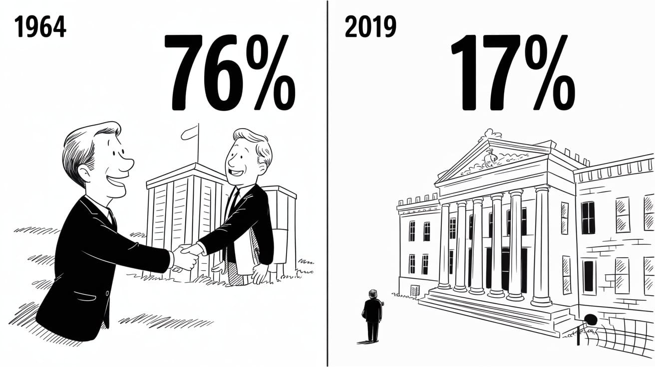 Back in 1964, 77% of Americans trusted their government. [1] By 2019—three years before ChatGPT was even a thing—that number had cratered to 17%. [2] We're not talking about a gentle slope here. This was a nosedive.