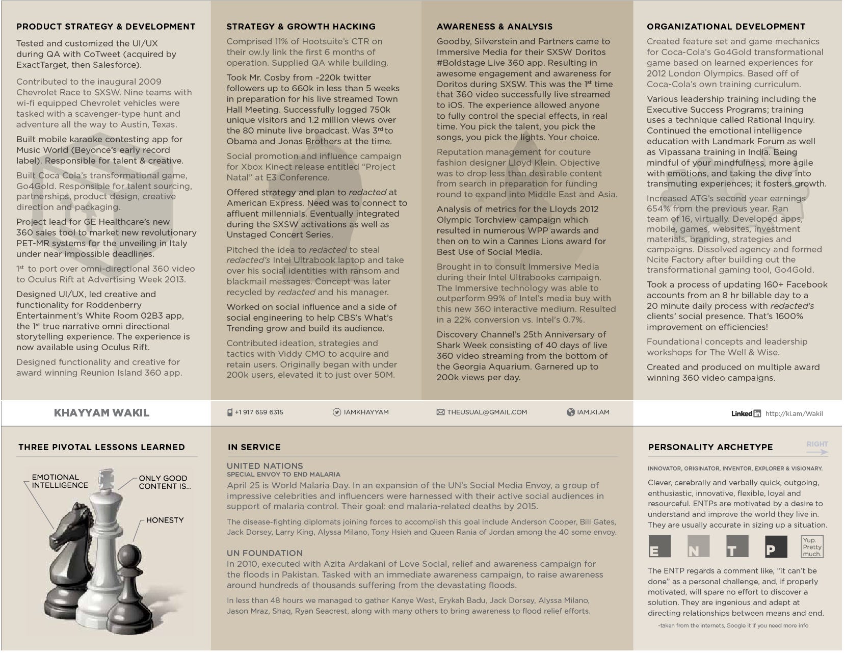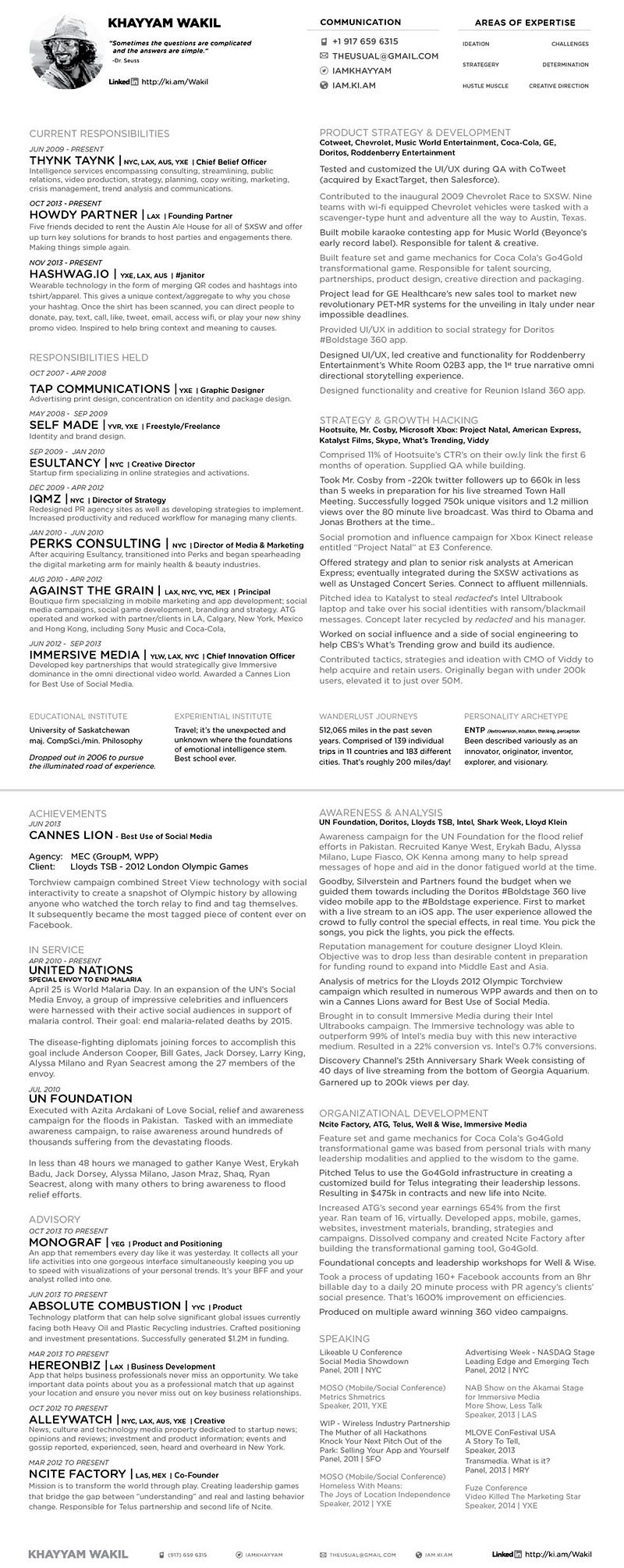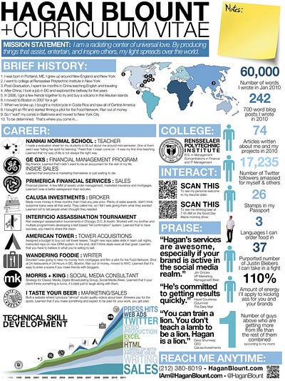 Google search landed me deep in article after article of the best resumes, like, ever. So I started clicking through all of them. Lots of infographic styles, some pretty crazy timelines and some outright terribly awesome resumes. You know, they’re so bad, they’re good. None you’d ever want to submit, but still, so, so funny. Happened to stumble on a resume of my mate, Hagan Blount and it that’s where it all began. The mission was to find a way to bring everything together in the neatest two pages possible.