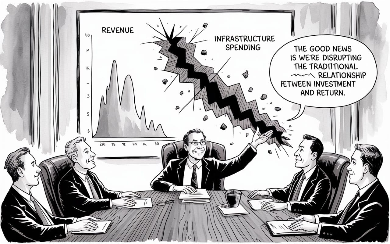 So we get 600 billion in infrastructure chasing 40 billion in revenue, financed with vendor loans, securitized through SPVs, rationalized with the same "this time it's different" rhetoric that precedes every disaster.