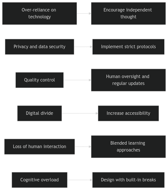 - Over-reliance on Technology: There's a risk that learners might become too dependent on AI for answers, potentially diminishing their own critical thinking skills. To mitigate this, it's crucial to design these tools to encourage independent thought and to use them as supplements to, rather than replacements for, human-led education.